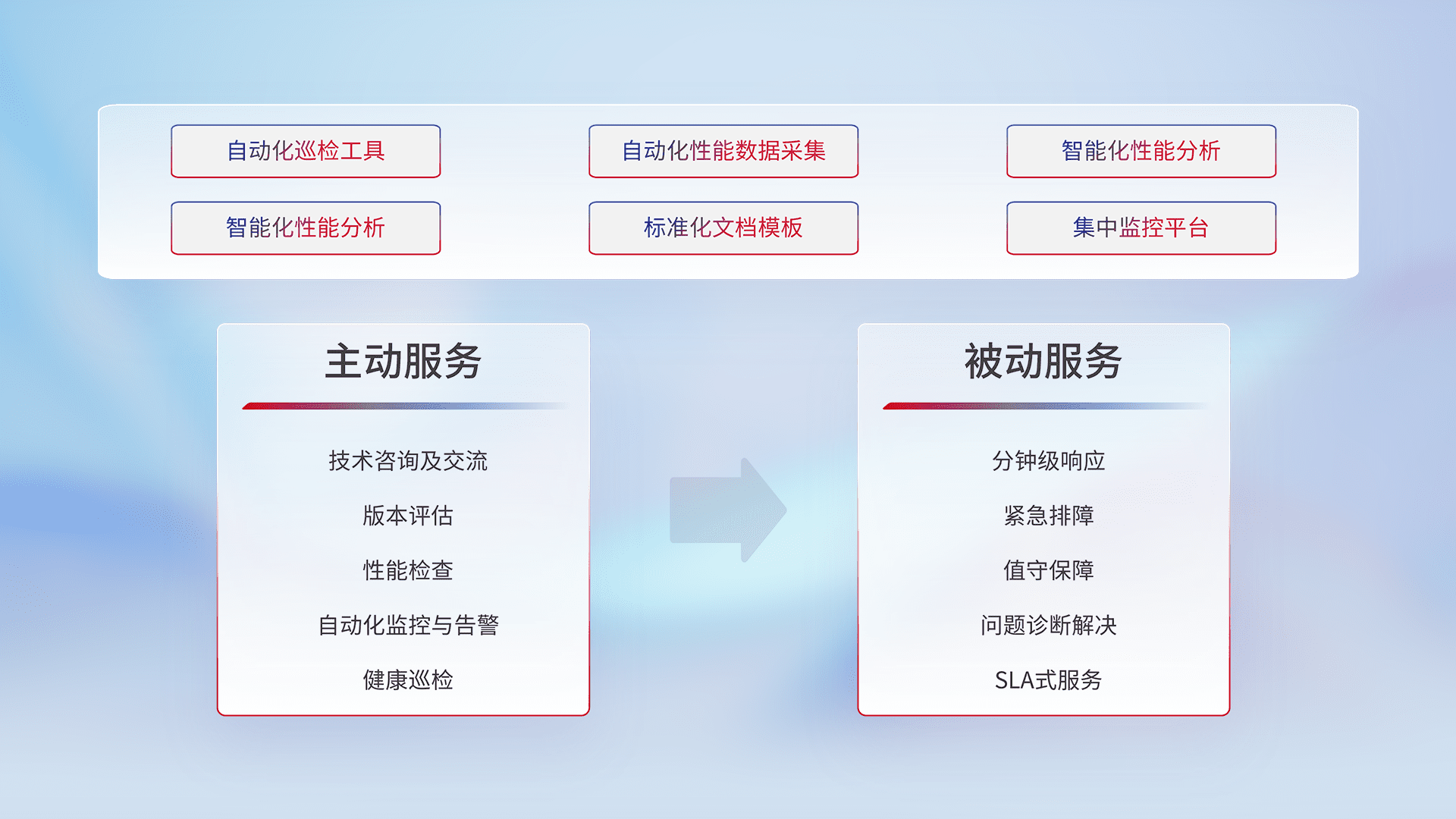 智能化工具和标准化文档,,,,保障服务质量,,,提供主动服务(包含技术咨询、、、版本评估、、、、性能检查、、自动化监控与告警、、健康巡检)和被动服务包含(分钟级响应、、、、紧急排障、、值守保障、、、、问题诊断解决、、SLA服务)。。